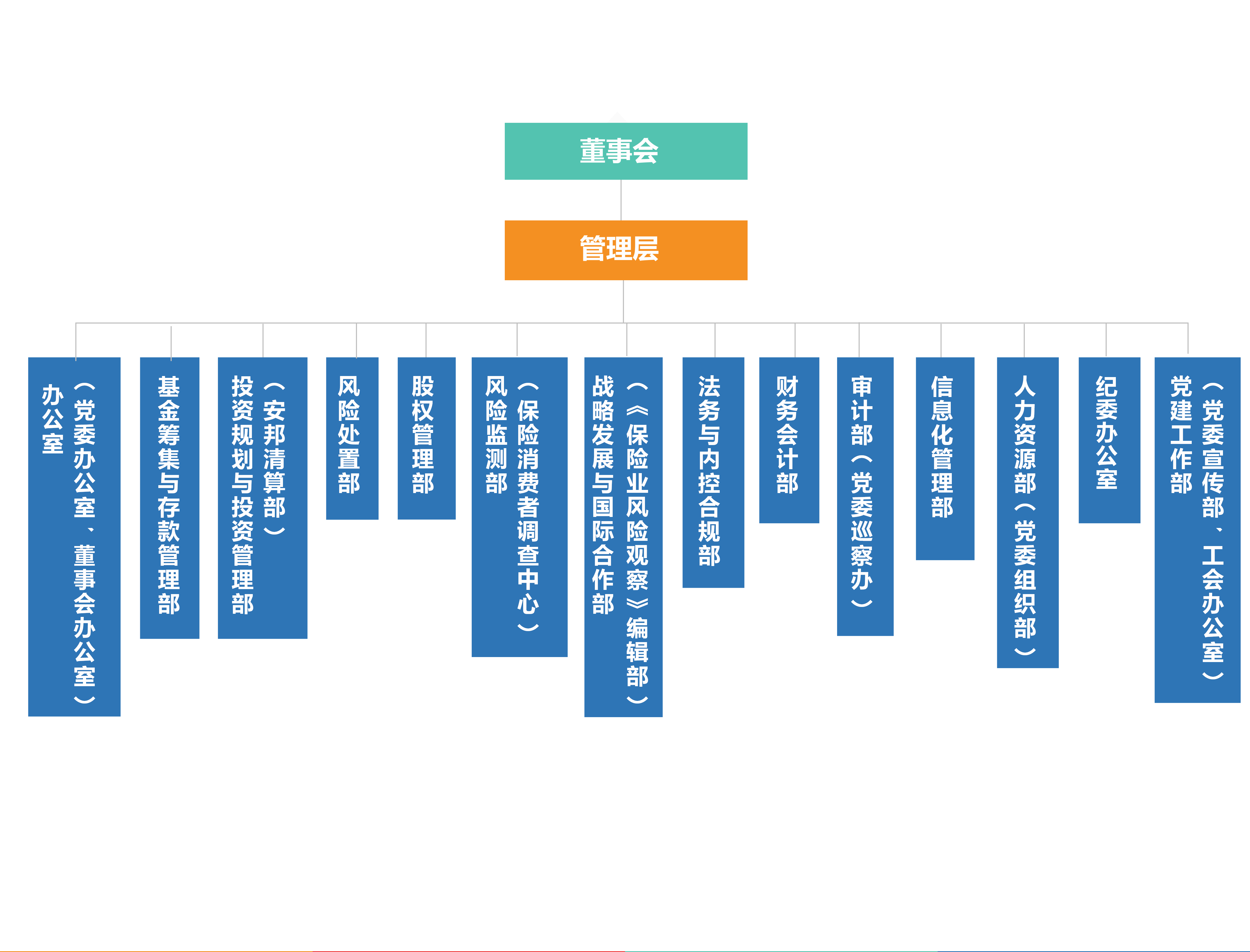 ??目前公司內(nèi)部機(jī)構(gòu)設(shè)置包括辦公室(黨委辦公室、董事會(huì)辦公室)、基金籌集與存款管理部、投資規(guī)劃與投資管理部(安邦清算部)、風(fēng)險(xiǎn)處置部、股權(quán)管理部、風(fēng)險(xiǎn)監(jiān)測(cè)部(保險(xiǎn)消費(fèi)者調(diào)查中心)、戰(zhàn)略發(fā)展與國(guó)際合作部(《保險(xiǎn)業(yè)風(fēng)險(xiǎn)觀察》編輯部)、法務(wù)與內(nèi)控合規(guī)部、財(cái)務(wù)會(huì)計(jì)部、審計(jì)部(黨委巡察辦)、信息化管理部、人力資源部(黨委組織部)、紀(jì)委辦公室、黨建工作部(黨委宣傳部、工會(huì)辦公室)共十四個(gè)部門。